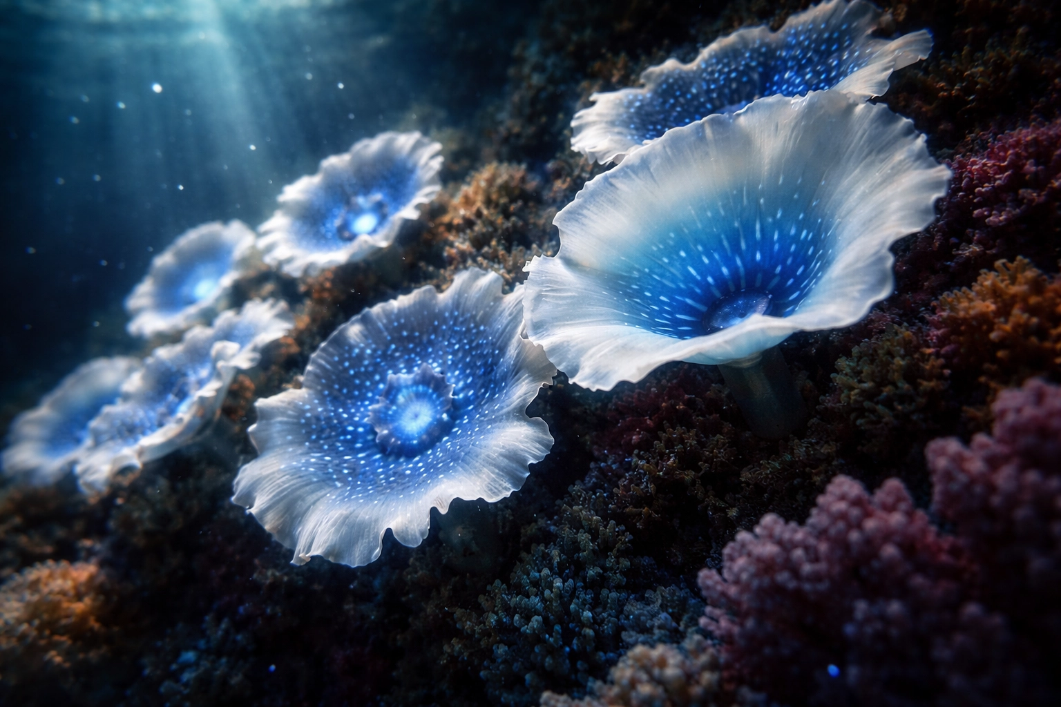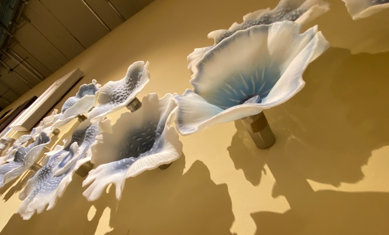 F,R. Maher knew immediately what piece to choose. It was 'Glimmers in Blue' by the talented glass artist, Verity Pulford. Painstakingly created in layers of pate de verre, intricately coloured and delicately sandblasted, it is an arresting piece of art. But what are those things? Organic, obviously. Are they flowers, coral or fungi? Imagining them propelling themselves lazily through the deep oceans, displaying a dazzling array of bioluminescence, F.R. Maher created a brief scene of such horror, it thrilled Emyr who demanded she had to write the rest of the play.